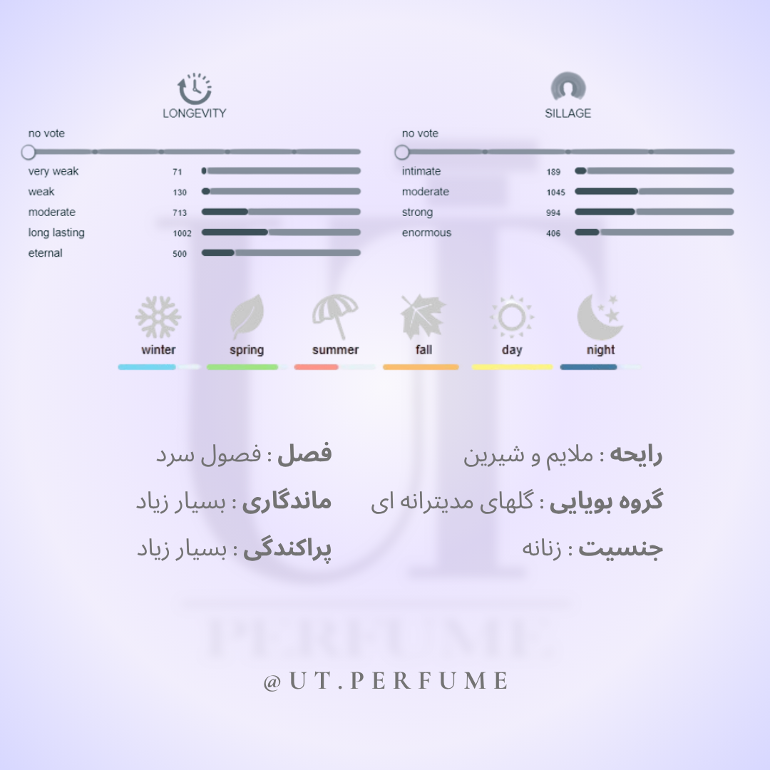 در خانواده چایپر گلی (Chypre Floral) قرار دارد و طبعی معتدل و شیرین دارد.