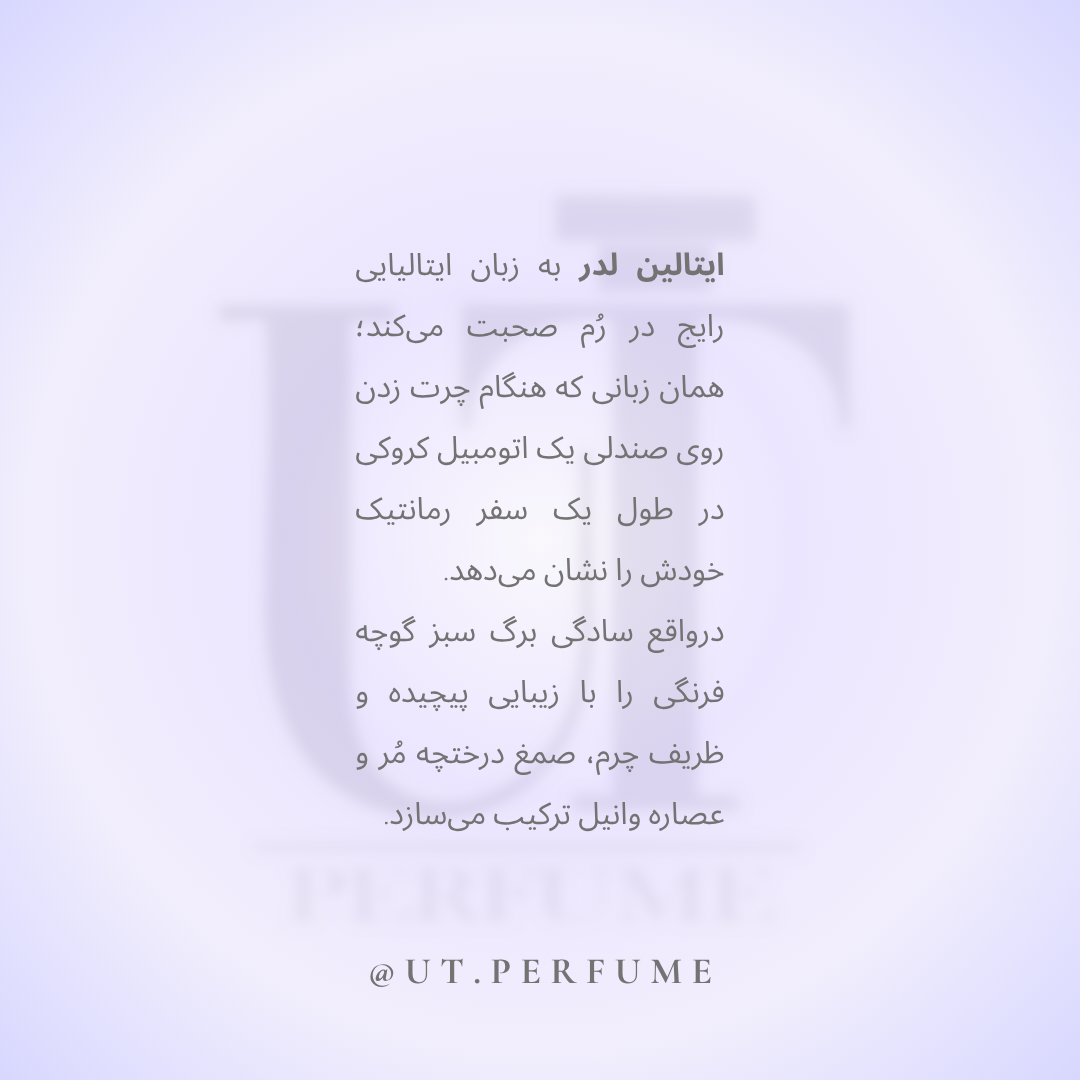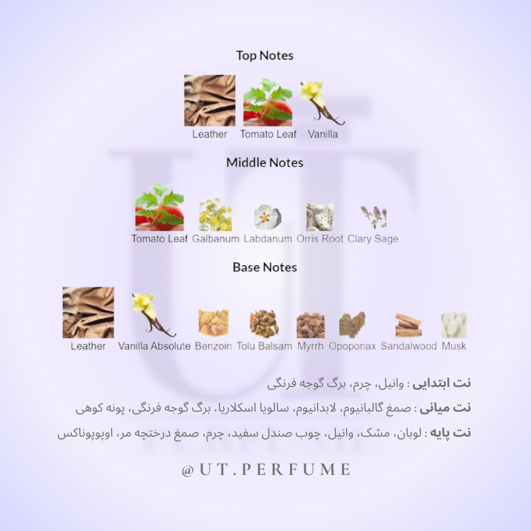 این عطر با ترکیبی بسیار خلاقانه از نت سبز و کمی تلخ برگ گوجه فرنگی با گرمای نرم چرم و وانیل،