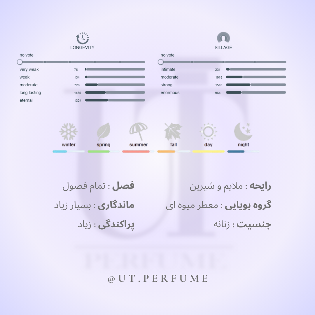 در خانواده گلی میوهای خوراکی (Floral Fruity Gourmand) قرار دارد و طبعی معتدل، شیرین و شور دارد.