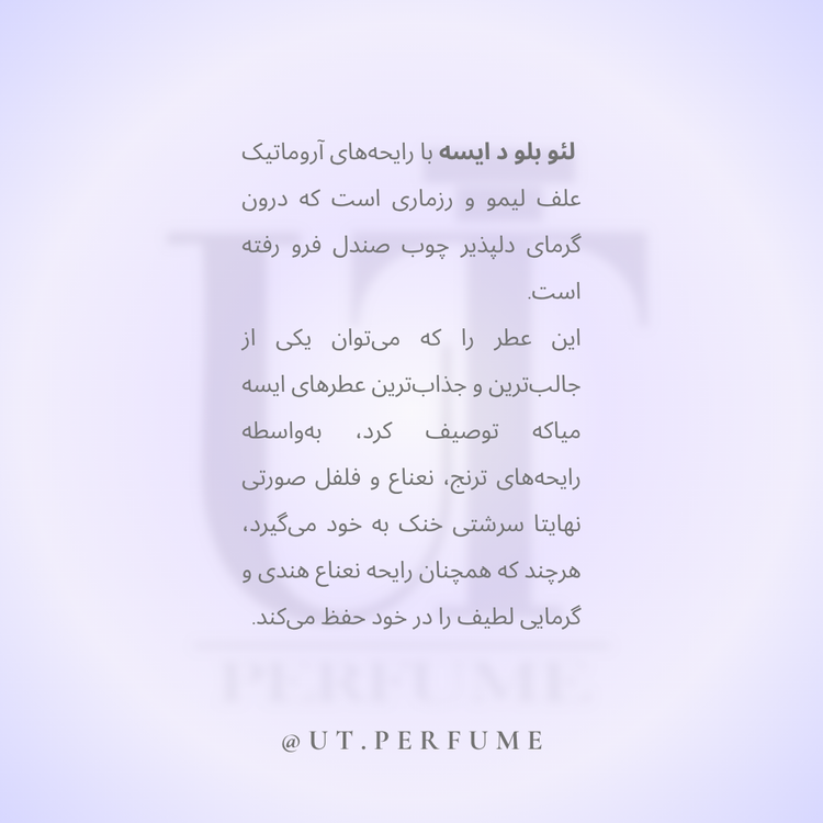 ایسیمیاکه است. "لئو بلو" (آب آبی) با رایحهای گیاهی، ادویهای و چوبی، تصویری از مردی مرموز و متفکر