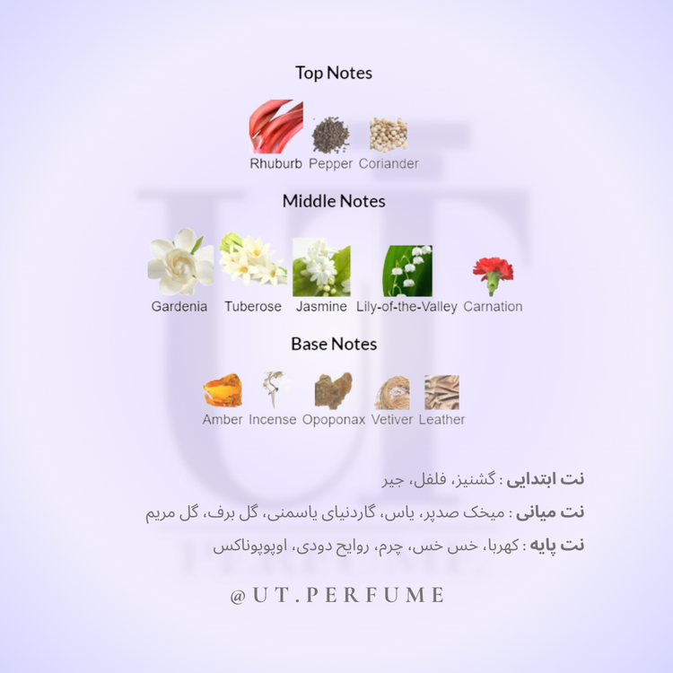 شده است. این عطر با ترکیبی از گُلهای سفید و صمغهای شرقی، نمادی از عشق نافرجام، وفاداری و