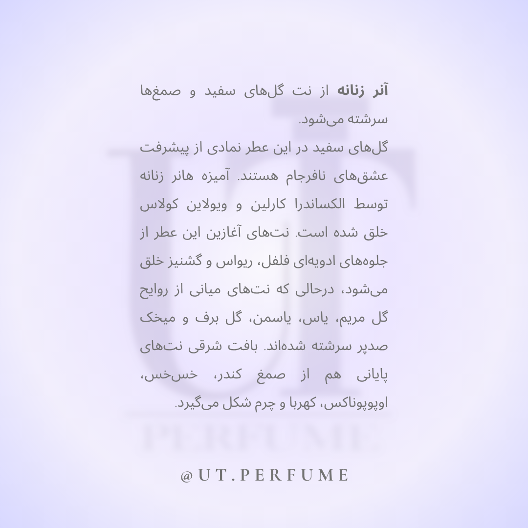 پاکی او در مواجهه با خیانت و فقدان است. گلهای سفید در این عطر، نماد پیشرفت عشقهای یکطرفه