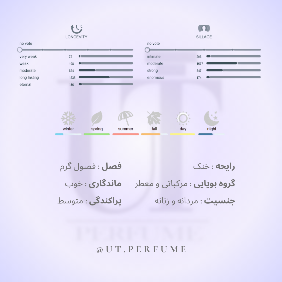 یک عطر چهارفصل بینظیر که به خصوص در بهار و تابستان میدرخشد. برای استفاده روزانه، محیط کار