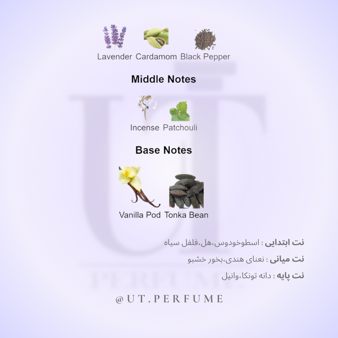 نتهای پایه: چوب صندل، نعناع هندی، عنبر – پایانی گرم، عمیق و ماندگار