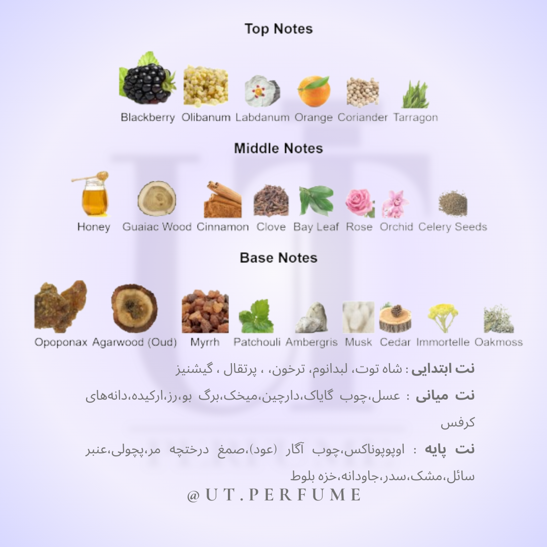 نتهای پایه: اوپوپوناکس،چوب آگار (عود)،صمغ درختچه مر،پچولی،عنبر سائل،مشک،سدر،جاودانه،خزه بلوط