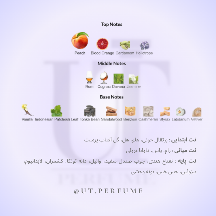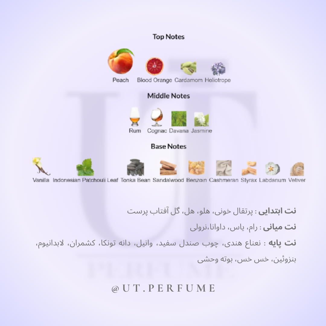 نتهای پایه: برگ پچولی اندونزیایی، چوب صندل، وانیل، دانه تونکا، کشمیران، بنزوئین، لابدانیوم