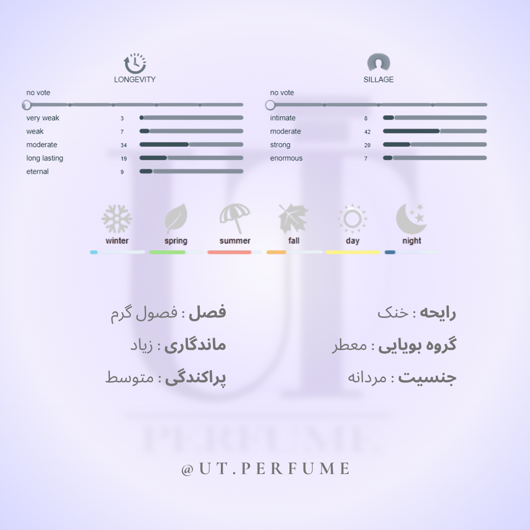 سبک آمریکایی است. این عطر با رایحهای سبز، چوبی و کمی صابونی، حسی از تمیزی بعد از حمام
