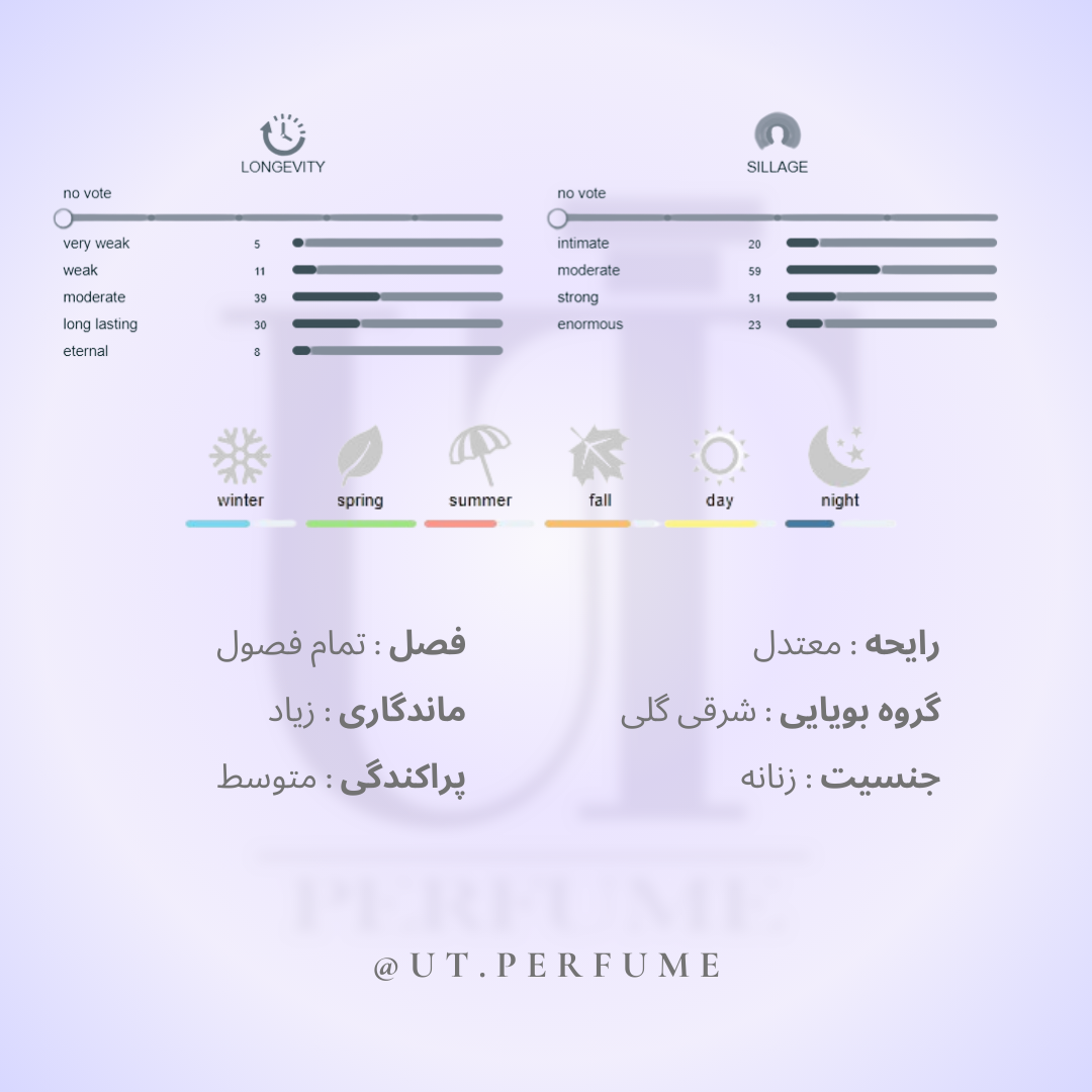 عطر در خانواده شرقی گلی قرار گرفته و طبعی معتدل و شیرین دارد.