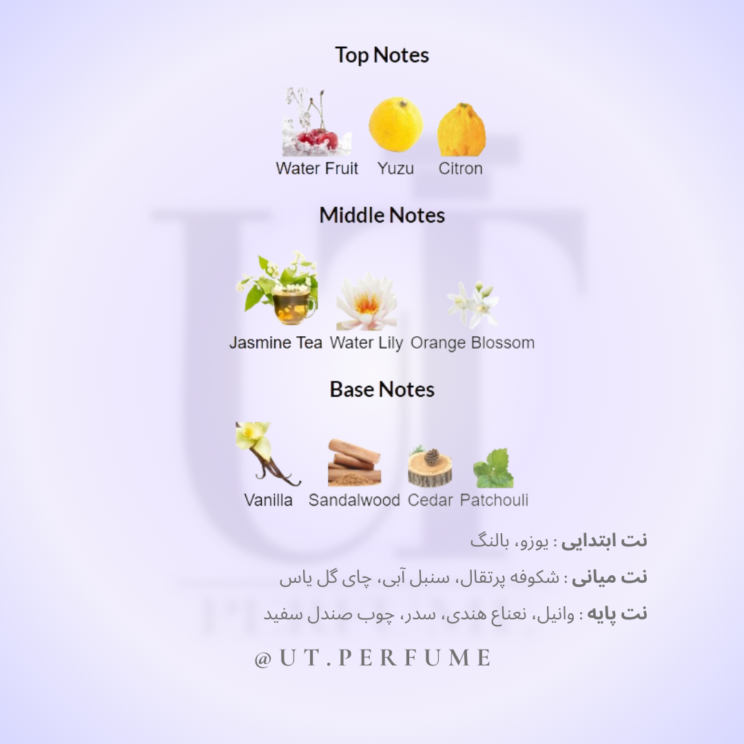 این عطر با ترکیبی هنرمندانه از طراوت میوهها، لطافت گلهای سفید و گرمای وانیل، حسی