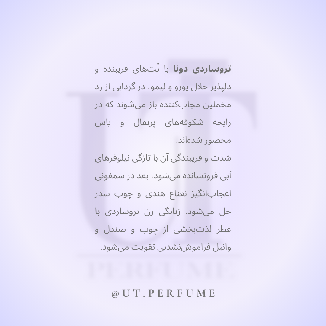 جذابیت و وقار را به همراه دارد. دونا عطری متعادل و همهپسند است که امضای شما در هر موقعیتی خواهد بود.