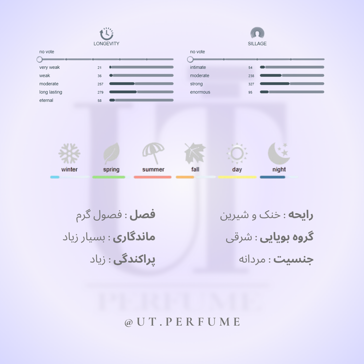 در خانواده بویایی شرقی (Amber / Oriental) با رگههای آروماتیک قرار دارد و طبعی خنک دارد.