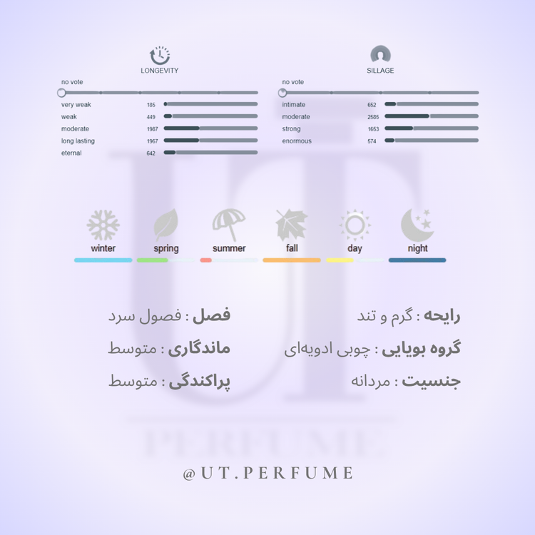 این عطر در خانواده بویایی شرقی (Amber / Oriental) قرار دارد و طبعی گرم و کمی تند دارد.