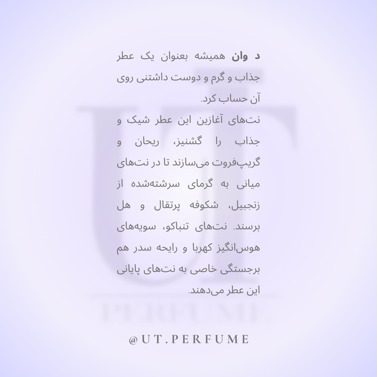د وان جنتلمن؛ نهایت وقار و متانت "د وان جنتلمن" عطری برای مردی است که نیازی به خودنمایی ندارد؛